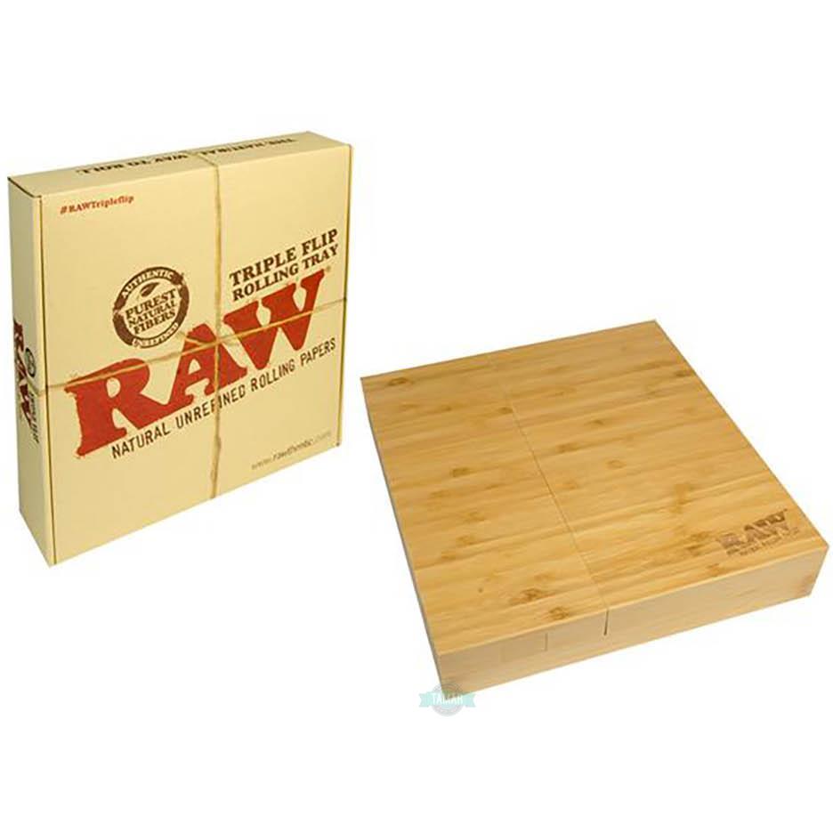 Vassoio per rollare estremamente cool di RAW® - il vassoio per rollare Triple Flip realizzato in robusto legno di bambù. RAW® è stato armeggiato e testato per quattordici mesi, e il risultato è il super pratico tablet over-the-top. Confezionato in una scatola per pizza di medie dimensioni, il vassoio per rollare è grande il doppio, perché il coperchio è composto da due parti che possono essere attaccate a sinistra e a destra della parte inferiore. Il fissaggio avviene tramite magneti super potenti. Pertanto, il vassoio per rollare è anche molto facile da configurare. E ciascuna delle tre parti può essere utilizzata anche singolarmente.